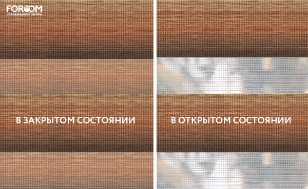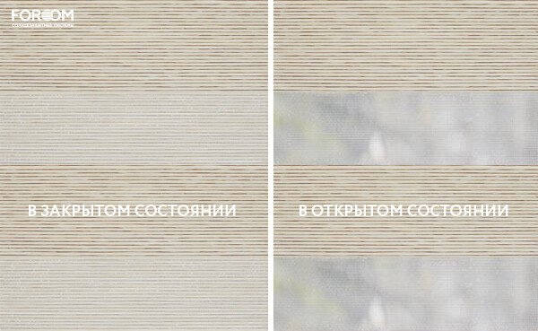 Полотно ткани, состоит из чередующихся горизонтальных полос – прозрачных и непрозрачных. Изменяя положение этих полос относительно друг другу, можно создать целых 3 режима регулировки светом. Например, чтобы в помещении стало светлее, нужно расположить прозрачные полосы друг напротив друга. Если разместить прозрачную и непрозрачную полосу параллельно друг другу, то можно добиться практически полного затемнения.